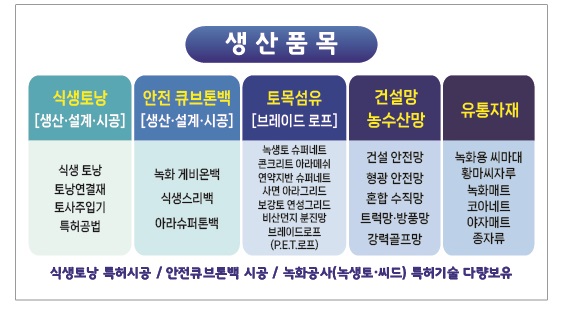 01. 23년 무코팅 토목.조경 섬유보강제류 신제품개발▣ 토낭 전용아라그리드 신제품 (특허) ▣ 슈퍼네트(법면녹화용,녹생토겸용)신제품(특허) ▣ 콘크리트 아라그리드-신제품(특허) ▣ 슈퍼그리드(연약지반보강용)신제품(특허) ▣ 건설안전망(형광건설망)신제품(특허)▣ 혼합 수직보호망▣ 비산먼지 방지매트